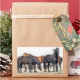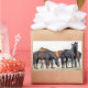A photographic design of a herd of horses waiting to be fed.