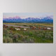 This photo features a herd of horses runs in front of the Grand Teton mountain range in rural Wyoming during the early morning light.