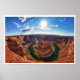 Beautiful photograph of Horseshoe Bend, a turn in the Colorado River within the Grand Canyon as seen from above. Above the canyon the sun shines in a blue sky with wisps of white clouds.