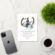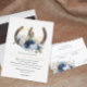 Beautiful shades of dark and dusty blue flowers decorate two horseshoes on this elegant rustic wedding invitation with real gold foil names boldly across the main design.