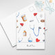 Thank you card for health workers. With a beautiful hand drawn pattern of medical equipment, this postcard will be perfect for birthday, thank you or thinking of you. Personalise the text with your own message if necessary. Illustrated and designed by Patricia Alvarez.