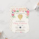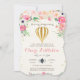A gold foiled hot air balloon surrounded by a frame of garden woodland pink and orange floral flowers and gold glitter. Up up and away!
