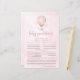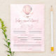 This is a Pink Hot Air Balloon baby shower predictions activity. It allows guests to guess the gender, date of birth, time, weight, hair colour, eye colour, length, etc. There is also a line to give advice.