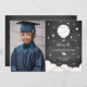 A graduation annoucement featuring a dark grey watercolor inspired background with white text surrounded by stars and illustrations of white hot air balloon and clouds with white graduation cap at bottom. Personalise the text and photo on front.