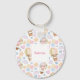 Key chain with a cute and whimsical pattern. Hot air balloons and cute clouds with faces among stars and hearts and balloons. Soft pastel colours make up this adorable design. A white square layered over top with your text inside.
