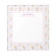 A notepad with a cute and whimsical pattern. Hot air balloons and cute clouds with faces among stars and hearts and balloons. Soft pastel colours make up this adorable design. A white square with a pink border layered over top to write inside.