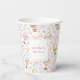 Paper cups with a cute and whimsical pattern. Hot air balloons and cute clouds with faces among stars and hearts and balloons. Soft pastel colours make up this adorable design. A white square layered over top with your text inside.