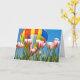 Spring tulips in garden with hot air balloon floating by for birthday.