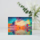 A colourful scenic landscape image of a hot air balloon flying into the sunset over the water.