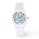 Multi-coloured hot air balloons in cloudy dotty blue sky on watch.