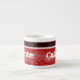 Espresso cup with caliente text which means hot on a dark red background and black stripe around the top