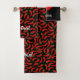 Red hot chilli peppers. Custom background colour. Pepper icon on wash cloth. Seamless pattern on hand and bath towel. Custom text on all three towels.