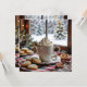 A beautiful seasonal Christmas card you can personalise with your own custom holiday greeting, with an illustration of hot chocolate, sugar cookies, dried orange slices, cinnamon sticks and a Christmas tree outside a winter window.
