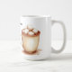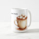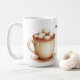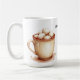 This inviting image showcases a warm, rich hot chocolate, served in a cream-colored mug with a reddish-brown rim. The mug is generously filled, topped with a delightful heap of soft, white marshmallows that are gently melting into the drink. Below the mug, a small, charming spill of the beverage adds a touch of rustic coziness, suggesting a freshly poured and comforting treat. This scene has been placed on a mug