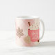 Enjoy sipping hot chocolate from this mug! This design features a warm mug of hot chocolate with whip cream on top surrounded by cinnamon and sweet gingerbread cookies on a pink plaid background.