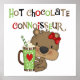 A brown girl teddy bear with a cup of steaming hot chocolate and a peppermint cane on Hot Chocolate Connoisseur holiday t-shirts, cards, mugs, tote bags, sweatshirts, keychains, bags, and other items perfect for the person who absolutely loves hot chocolate!