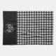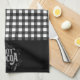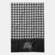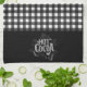 This chalkboard hot cocoa kitchen towel features chalk hand lettering that says "Hot Cocoa" on a black background. The lettering features decorative swashes and ornamental swirls. The top of the towel is black and white check.