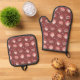 Here is a cute oven mitt and pot holder set for the Holidays featuring a doodle pattern of hot cocoa mugs , some candy canes , marshmallows and Christmas plants . All this on a burgundy-colour background . Look for the matching kitchen towel and apron .