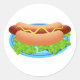 Illustration of a tasty hotdog covered in mustard and resting on a bed of lettuce leaves. Image available on various gifts and products. Stickers.