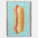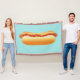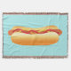 This blanket features a delicious cartoon illustration of a hot dog snack. The hot dog has a tasty looking bun and there are both ketchup and mustard on top of the sausage.