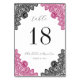 Elegant hot pink and black wedding table number card featuring delicate floral lace.