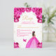This elegant and glamourous rsvp card features a beautiful princess with brunette hair in a hot pink ball gown. The text combines handwritten script and modern sans serif fonts for a classy and sophisticated look. The floral arrangements, butterfly and gold confetti create the perfect blend of rustic and chic. Perfect for a sweet sixteen party or birthday party.