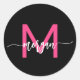 Hot Pink Black Modern Script Girly Monogram Name Classic Round Sticker