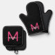 Hot Pink Black Monogram Girl's Kitchen Script Oven Mitt & Pot Holder Set