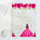 This elegant and glamourous birthday party invitation features a beautiful princess with brunette hair and fair skin in a hot pink ball gown. The text combines handwritten script and modern sans serif fonts for a classy and sophisticated look. The floral arrangements, butterflies and gold confetti create the perfect blend of rustic and chic.