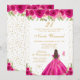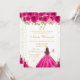 This elegant and glamorous birthday party invitation features a beautiful princess with brunette hair and fair skin in a hot pink ball gown. The text combines handwritten script and modern sans serif fonts for a classy and sophisticated look. The floral arrangements, butterflies and gold confetti create the perfect blend of rustic and chic.