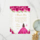 This elegant and glamorous sweet sixteen thank you card features a beautiful princess with brunette hair and fair skin in a hot pink ball gown. The text combines handwritten script and modern sans serif fonts for a classy and sophisticated look. The floral arrangements, butterflies and gold confetti create the perfect blend of rustic and chic.