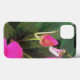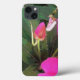 The artwork on this iPhone 13 Case is an original photograph by MaeFlowers of a New Guinea impatiens plant, in bloom with hot pink flowers. The photo is a closeup showing parts of the bright pink flower petals, a flower bud in a more pale pink colour, and the remains of an earlier bloom. The dark green leaves of the impatiens are long and pointed, with jagged edges against a warm light grey background. The design has a tapestry texture.