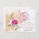 Beautiful wedding save the date postcard with a watercolor floral design containing hot pink flowers, pale roses, soft green eucalyptus leaves, and colourful pastel splashes. Easy to update the front and the back with your personal message!