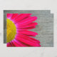 A fun and vibrant wedding invitation featuring a photo of a hot pink daisy peeking from left side over a background of barnwood. Opposite side features barnwood background with text at centre inside a white rectangle outlined in hot pink matching the daisy. Personalise with details of your occasion. Wording is from bride's parents.