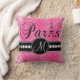 This distressed hot pink damask pattern American MoJo Throw Pillow with personalised monogram, the word Paris with the Eiffel Tower and a line of printed white diamonds on a black band will look amazing in your bedroom or living room as an accent pillow. Monogram Gallery Gifts© Elke Clarke Designs ©