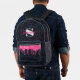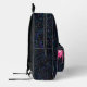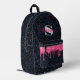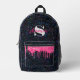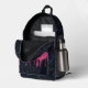 This custom printed backpack features a black liquorice rainbow glitter background, with hot pink glitter dripping from the front zip pocket, The template allows for easy personalisation, including a large monogram initial and / or a full name in a neon pink calligraphy script font. Either can be easily eliminated by simply leaving the custom text box blank.