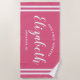Personalised beach towel design for a girls' weekend vacation getaway features a custom first name in modern script writing framed by coastal stripes, with custom text for the occasion. The hot pink background colour can be modified. Please visit our shop for other colour options.
