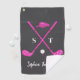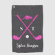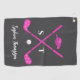 Looking for a stylish personalized golf towel for women that doesn’t get lost or look boring? This chic towel features bright hot pink golf clubs with white bows, a matching golf hat, and a crisp white golf ball on an elegant gray background. Customize it with initials and a full name for a polished, personal touch.