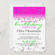 Dazzling birthday party invitation begins with hot pink. Then tiny hearts of all colours and sizes create the cutest confetti. It begins at the top of the invitation. As it moves down the page the pink becomes softer and then fades out so you can see the text. Then the bright green text provides a visual pop. Perfect for a teen who wants a more grown up design. Perfect for a woman who wants a colourful and modern design. Modern preppy with a fresh spin on the pink and green combo.