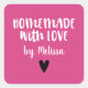 A personalised "homemade with love" sticker on a square shaped, hot pink coloured background. Make it yours by adding your own name. A pretty finishing touch for all of your handmade gifts. Designed for you by Blackberry Boulevard.