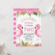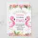Flamingo themed girl's any age birthday invitation featuring two pink flamingos, pink flowers, tropical foliage and faux gold dots. Great for a flamingo themed girl's birthday party.