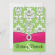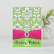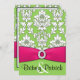 Hot Pink & Lime Green Damask Wedding Invitations---match the RSVP cards and more found below on this page. Each invitation features a printed hot pink decorative bow with a diamond trimmed buckle over a green and white floral damask print. These wedding invitations are set to high quality basic card stock; however, you can change the stock to linen, felt (embossed), recycled, and several metallic shades if you would like under number 2 (choose your style, size & paper type) below the orange add to cart button. A list of the additional costs for a fancier card stock are displayed also under that option. Each invitation comes with a fitted white envelope.