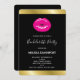 Bachelorette party invitation with an illustration featuring hot pink lips. Bold and vibrant image. Faux gold gradient border along the top and bottom borders. Set on a black background.