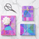 Three different stylish and geometric patterns in gorgeous vibrant shades of pink, green, blue and purple. Heavily textured layers of hand paintings and digital media.