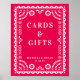 This elegant yet modern papel picado inspired wedding reception sign features a beautiful ornate frame in white, a bright pink background, and modern typography. Customise this template as a table sign for favour, guestbook, menu, buffet, etc. The default size is 8" x 10" which fits great in a standard size photo frame that can be placed on a table.