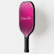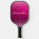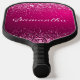 Cute and girly pickleball paddle with your name printed in an elegant script font onto a hot pink and silver glitter background.