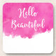 A plastic coaster with "Hello Beautiful" written in a trendy font. A cute girly design with a bright pink watercolor paint splatter.
