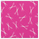 Hot pink fabric with a modern pattern of scissors in white. Perfect for barbers, hair dressers, and similar.