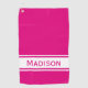 Play golf in style with this personalised golf towel. This design has a solid hot pink background colour with white stripes and a modern font. This is a terrific gift for women and girl golfers playing in golf tournaments or recreational golf. It's also a lovely gift for golf coaches and instructors. The name and colour can be customised in the personalisation options. Change colours to your favourite combination or match your golf bag or team colours.