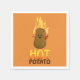 Cute brown potato with sticks for arms and a big happy fave surrounded by flames. Below in yellow and orange letters is the word hot, and below that in brown letters is the word potato.